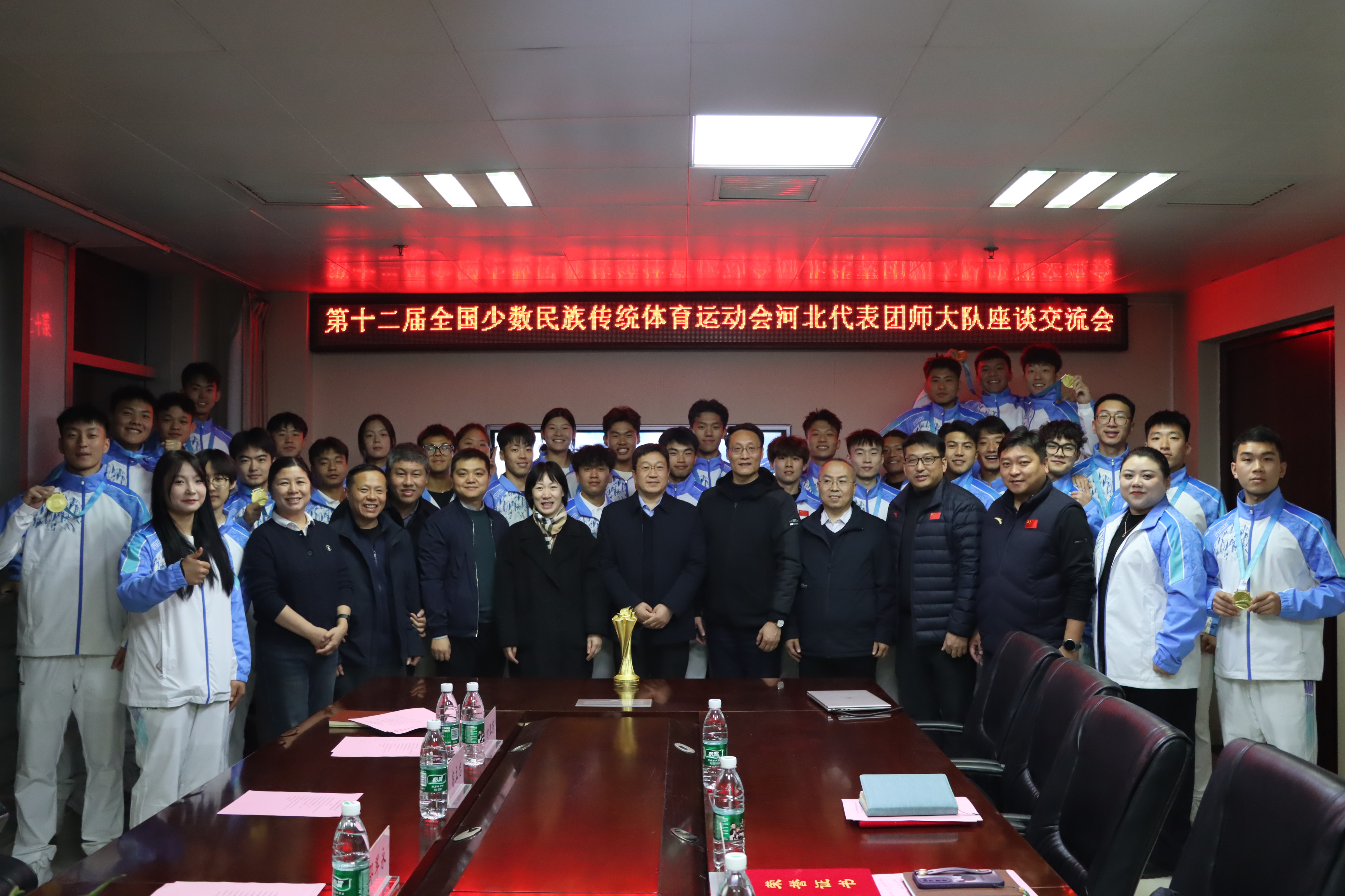 邵军永指出,全国少数民族传统体育运动会是民族团结的盛会,我校学生参加全国性高规格赛事是一件幸事,大家既是参与者、贡献者,也是受益者。大家将河北地域优秀传统文化融入体育竞赛,呈现到全国赛台,既是对中华优秀传统文化的创新传承,也是对williamhill英国威廉希尔官网育人效果的展示。他强调,要深刻认识参与比赛的重要性、参赛主体的特殊性、竞赛内容的文化性特点;要认真总结为什么参赛、发现了什么、收获了什么,要将集体的荣誉、一致的目标、辛苦的付出转化为前进的动力。希望全体教练员、运动员把比赛带来的良好精神风貌带入到今后的工作和学习当中去,珍惜荣誉、团结协作、创新发展。威廉希尔中文网站体育文化传播系主任王淑英详细介绍组队参赛情况。她表示,我校共派出38名运动员、4名教练员和3名领队,代表河北省参加板鞋竞速、高脚竞速和表演项目常山战鼓等三个项目的比赛。在备赛过程中,队伍面临少数民族运动员数量不足、技术理解不深刻、参赛经验少等多重挑战,在学院领导的支持和全体成员的共同努力下,大家克服重重困难,积极备战。最终,表演项目常山战鼓在170个参赛队中脱颖而出,荣获一等奖,成为河北省七个一等奖之一,高脚竞速和板鞋竞速项目也取得历史最好成绩。座谈会上,教练员和运动员们积极分享参赛感悟和收获。他们表示,通过参与这次大赛,不仅提升了运动技能和民族体育知识,还开拓了视野,增强了集体荣誉感,更加深刻地理解了铸牢中华民族共同体意识的重要性。与会领导对参赛队伍获得的优异成绩表示热烈祝贺。