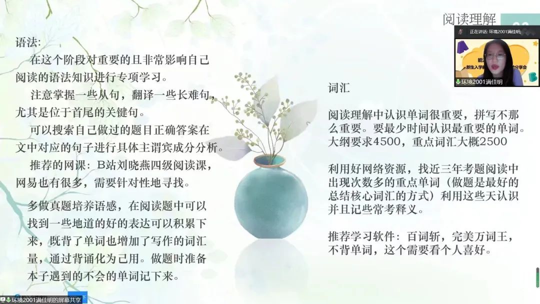 满佳明同学为同学们带来“四级学习方法”的分享。她先为大家介绍了大家需要了解到的有关于四级考试的基本内容,包括卷面组成、考试流程、答题顺序以及信息获取等,然后根据卷面结构分题型向大家分享各个题型考查的侧重点以及各个题型所对应的具体的答题策略与技巧。最后,她为同学们提供了四级备考建议,以及复习英语的时间安排,助力新生在即将到来的十二月份的英语四级考试上旗开得胜,取得佳绩。