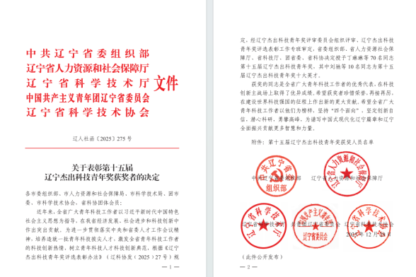 张万里教授荣获辽宁杰出科技青年奖。辽宁杰出科技青年奖是面向全省广大青年科技工作者的重要奖项,旨在以习近平新时代中国特色社会主义思想为指导,激励我省广大青年科技工作者在新时代建设世界科技强国的伟大征程中奋发进取,勇攀科学高峰,造就一批引领科技进步和学科发展的青年学术和技术带头人,为谱写中国式现代化辽宁篇章提供坚强人才支撑。