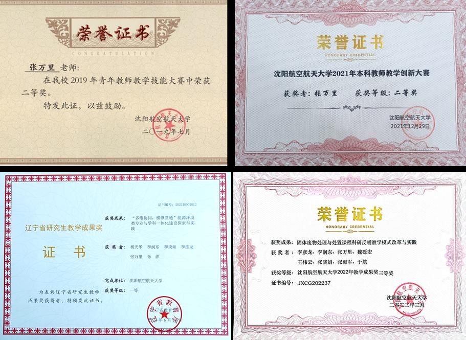 他时刻不忘作为人民教师的光荣使命,以高标准严格要求自己,尽职尽责做好教学工作。承担课程 4 门,指导课程设计、毕业设计、实习 600 余人次。奉行育人为本,立德树人的理念,不断提高教学水平,所编教案作为标准模板在学院推广使用。不断学习先进教学方法,改进教学手段,努力打造金课,主讲课程《能源、环境与可持续发展》年选课 2000 人,入选辽宁省一流课程、校优秀课程思政示范课。不断强化教学技能,创新教学设计,获校教师教学创新大赛二等奖(2021)和校青年教师教学技能大赛二等奖(2019)。教学质量广受学生好评,2023 年获评沈阳航空航天大学“我最喜爱的老师”。