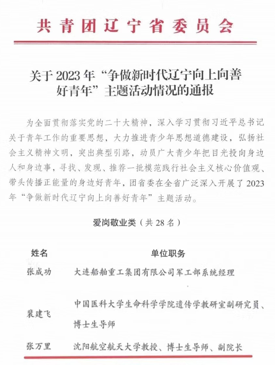 为全面贯彻落实党的二十大精神,深入学习贯彻习近平总书记关于青年工作的重要思想,大力推进青少年思想道德建设,弘扬社会主义精神文明,突出典型引路,动员广大青少年把目光投向身边人和身边事,寻找、发现、推荐一批模范践行社会主义核心价值观、带头传播正能量的身边好青年,团省委在全省广泛深入开展了2023年“争做新时代辽宁向上向善好青年”主题活动。经过集中资格筛选和专家评审,beat365张万里教授获评“辽宁向上向善好青年”。