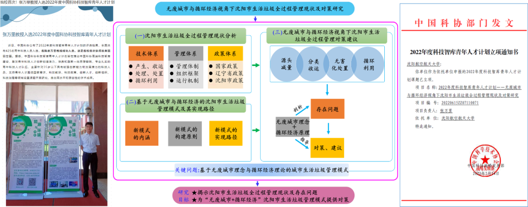 入选中国科协高端科技智库—中国科协科技智库青年人才计划,积极发挥高端智库作用,开展无废城市与循环经济视角下沈阳市生活垃圾全过程管理现状及对策研究,将无废城市理念与循环经济理论引入生活垃圾管理实践,以减量化、再利用、再循环为核心,融合废物无害化原则,拓展生活垃圾全过程管理范畴,打造“资源—产品—垃圾—无害废物+再生资源”的生活垃圾闭合循环链条,构建基于无废城市与循环经济的生活垃圾管理模式,并以此为指导优化沈阳市生活垃圾管理,提出该模式在沈阳市的潜在实现路径,为沈阳市推广生活垃圾分类、建立和健全生活垃圾全过程管理体系提供可行的对策建议,引领无废城市“沈阳模式”。