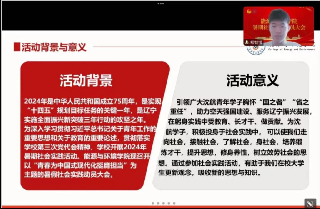 首先,实践部部长祁智博详细介绍了本次社会实践的背景和意义,他指出,此次活动不仅是一次学习和锻炼的机会,更是同学们将所学知识应用于实际、服务社会的重要平台。通过参与社会实践,同学们可以深入了解能源与环境领域的现状和问题,不断提升理论联系实际能力。他强调了活动的组织与开展流程,希望大家能够积极参与,展现沈航能环学子的风采。