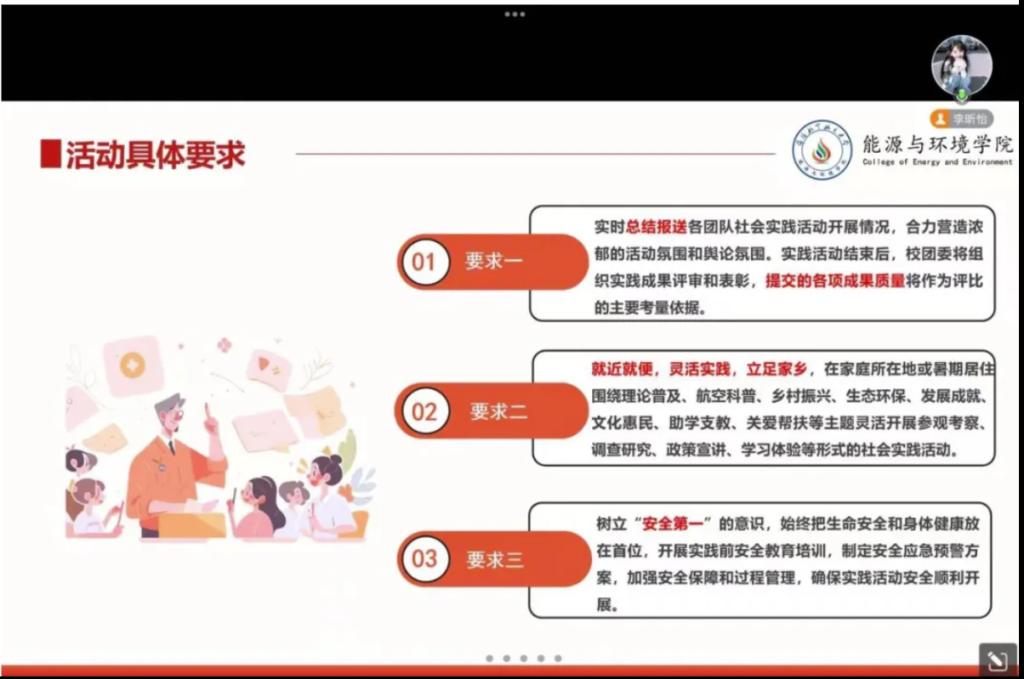 会议过程中由李昕怡同学详细说明了社会实践的具体要求,包括团队协作、安全注意事项以及实践成果的呈现方式。她提醒同学们要严格遵守纪律,认真完成每一项任务,确保实践活动的顺利进行。